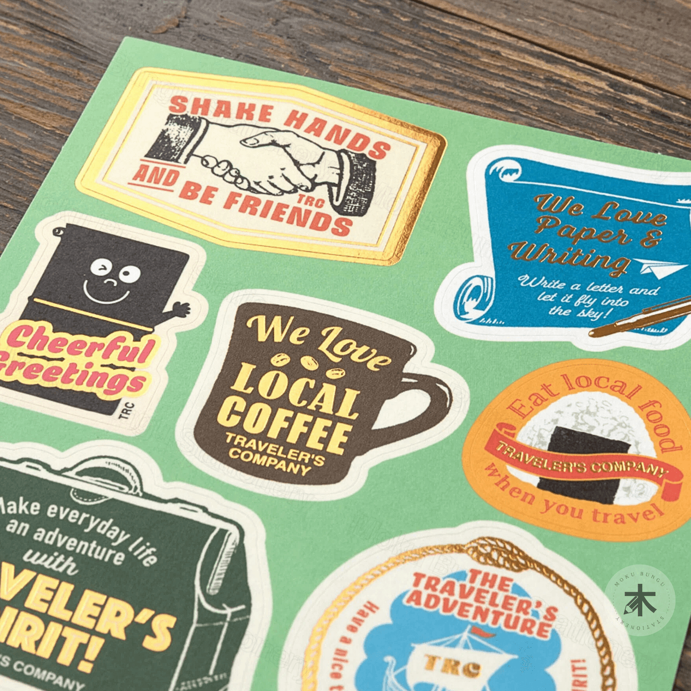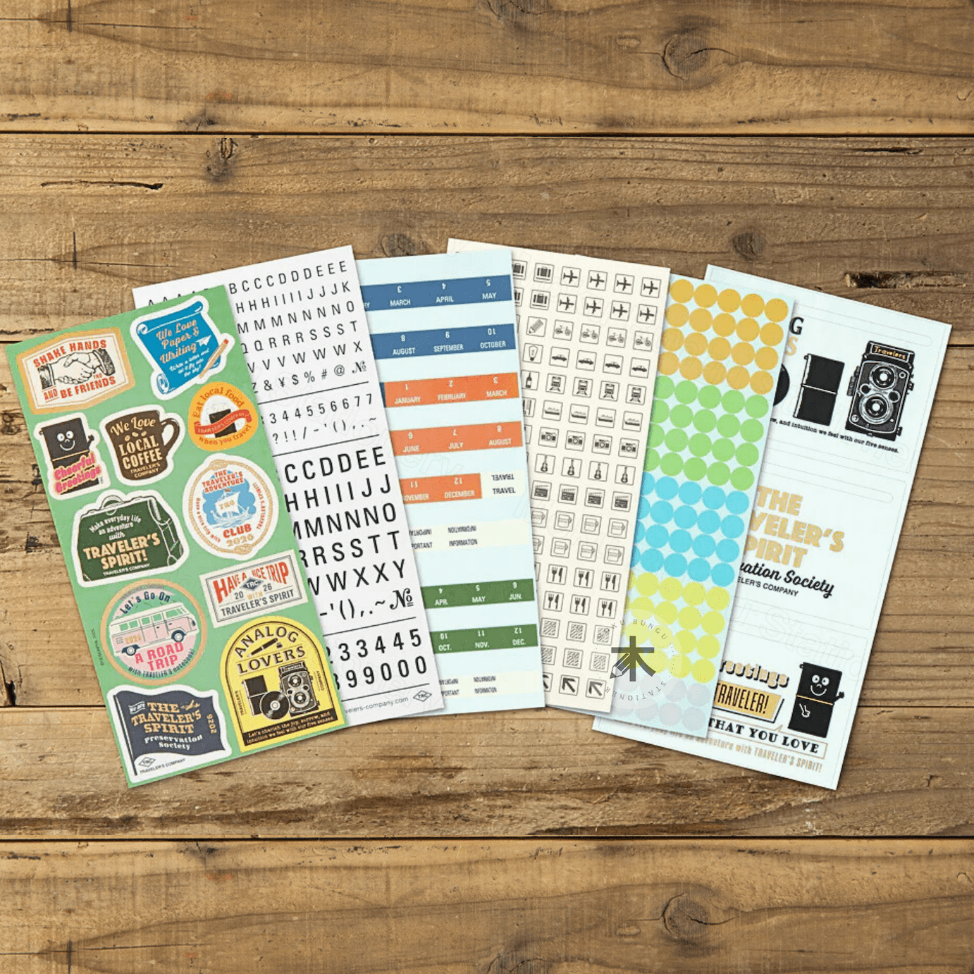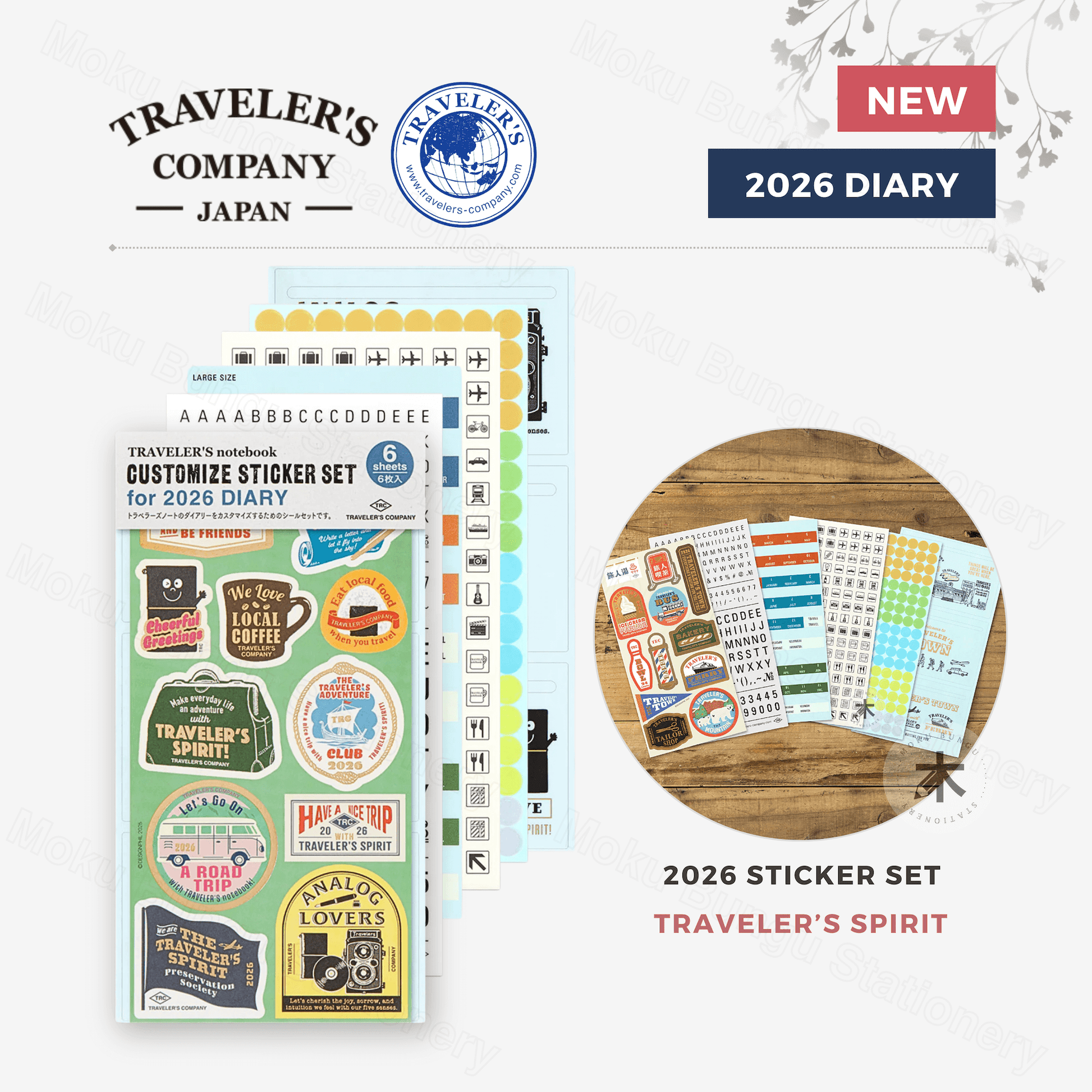 - This TRAVELER’S COMPANY 2026 sticker set comes with 6 sticker sheets that are designed to decorate and customise your TRAVELER'S notebook with motifs such as the a traveler’s bag, a coffee cup, and delicious onigiri.