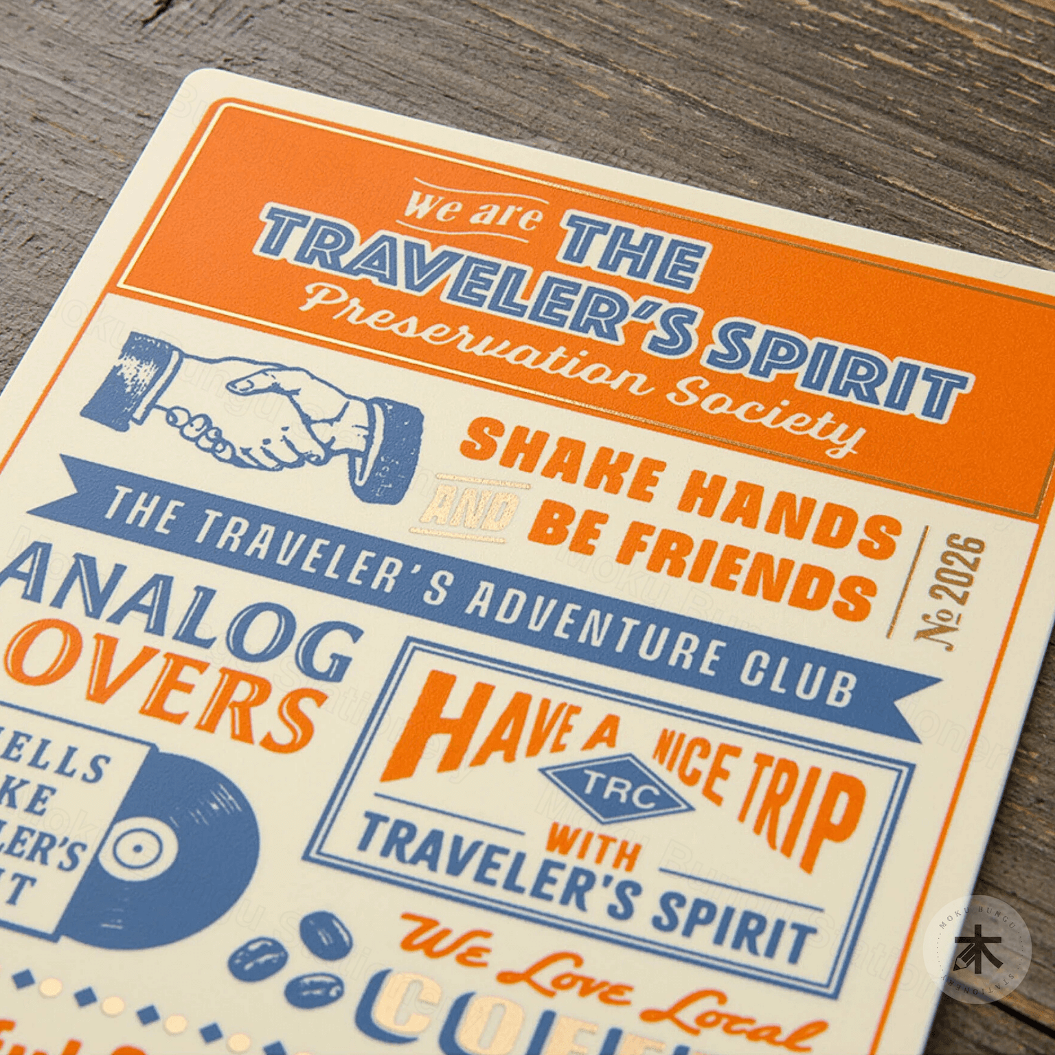 - Design of front – black vinyl record, ice cream soda, vintage car and other motifs inspiring everyday life an adventure with TRAVELER'S SPIRIT!