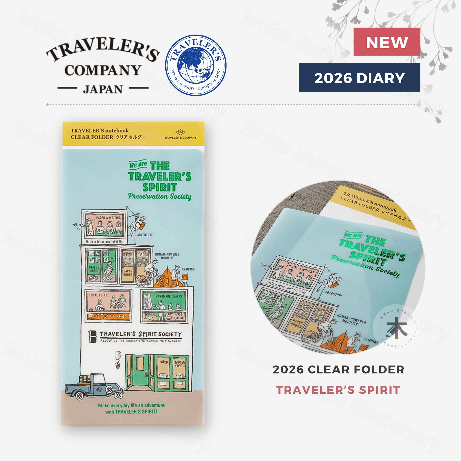 This TRAVELER’S COMPANY 2026 clear folder is semi-translucent, and can be used for storing sheets of paper and other documents.